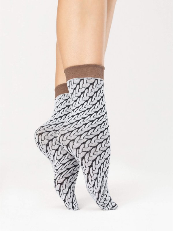 Fantastisch gestrickt! Mit Cute Knit von Fiore erhältst Du eine schicke Damensocke in Strickimitat. Ein weißes geflochtenes Muster mit einem gerippten Rand in einer natürlichen braunen Farbe. Die Farbkombination weiß/braun  ist eine tolle, dynamische Kombination. Die Söckchen werden mit einem Strickmuster gefertigt, das den gesamten Strumpf bedeckt. Diese Damensocken sind edel und verleihen durch ihre Strickoptik einen coolen Look. Diese Damensocken umhüllen Deine Füße im Herbst und Winter wunderschön und passen perfekt zu einem Paar Wildleder-Cowboystiefeln oder Lederstiefeln. Bei schönem Wetter kannst Du auch eine 7/8-Hose wählen, die den Knöchel etwas freilegt.