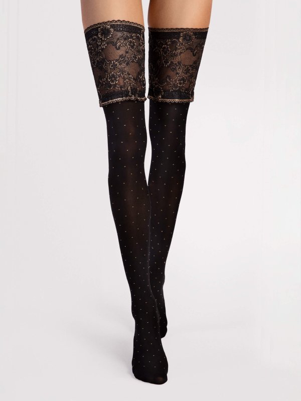 Fiore Stay Ups Notte in 40 den mit breitem Spitzenband und goldenen Punkten