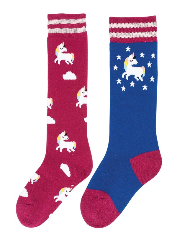 Weiche R.S. Harmony Kinder Kniestrümpfe mit Innenfrottee und verziert mit Einhörnern. Diese Harmony-Kniestrümpfe sind mit einem Komfortbund versehen. Die Kniestrümpfe fühlen sich superweich und angenehm am Fuß und Bein an. Der handgenähte Zehenbereich, die unauffälligen Nähte, sowie der verstärkte Zehen- und Fersenbereich sorgen für Komfort. Die Lieferung erfolgt als 2er-Pack in Rot/Blau