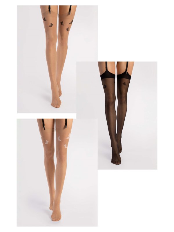 Farfalle ist ein wunderschöner Strumpf mit Schmetterlingen, die sich federleicht um den Oberschenkel bewegen. Farfalle bezaubert in 3 Kombinationen mit Schmetterlingen in Schwarz und Ecry auf einem Untergrund in Nude oder Schwarz. Der restliche Teil des Strumpfes ist in einem klassischen, zurückhaltenden Stil gestaltet, damit die Schmetterlinge ihr volles Potenzial entfalten können. Farfalle unterstreicht Deinen weiblichen Glanz und hebt die Stimmung mit Schmetterlingen, die leicht und mühelos fliegen, auf ein neues Niveau. Die Schmetterlinge lassen sich mit passenden High Heels noch mehr in Szene setzen und sind gleichzeitig ein Ausdruck Deiner weiblichen Energie. Die Strümpfe Farfalle verfügen über eine unsichtbare Zehenverstärkung für Eleganz. Sie werden aus Qualitätsgarn gefertigt und sind in 3 Kombinationen erhältlich.