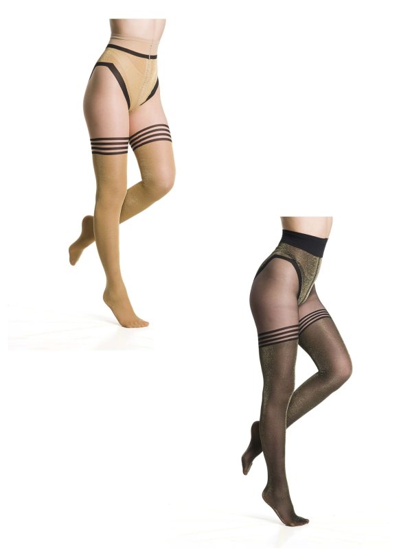 Diese extravagante Strumpfhose von Trasparenze vereint romantisches Design mit festlichem Glanz: Das raffinierte Stay-up-Look-Muster wird durch eingearbeitete Lurexfäden in Gold veredelt - von der Beinpartie bis zum Höschenbereich. Dank flacher Nähte, weichem Bund und perfekter Passform trägt sich Farenheit so angenehm, wie sie aussieht. Ideal für besondere Anlässe oder stilvolle Abende mit femininer Ausstrahlung.
